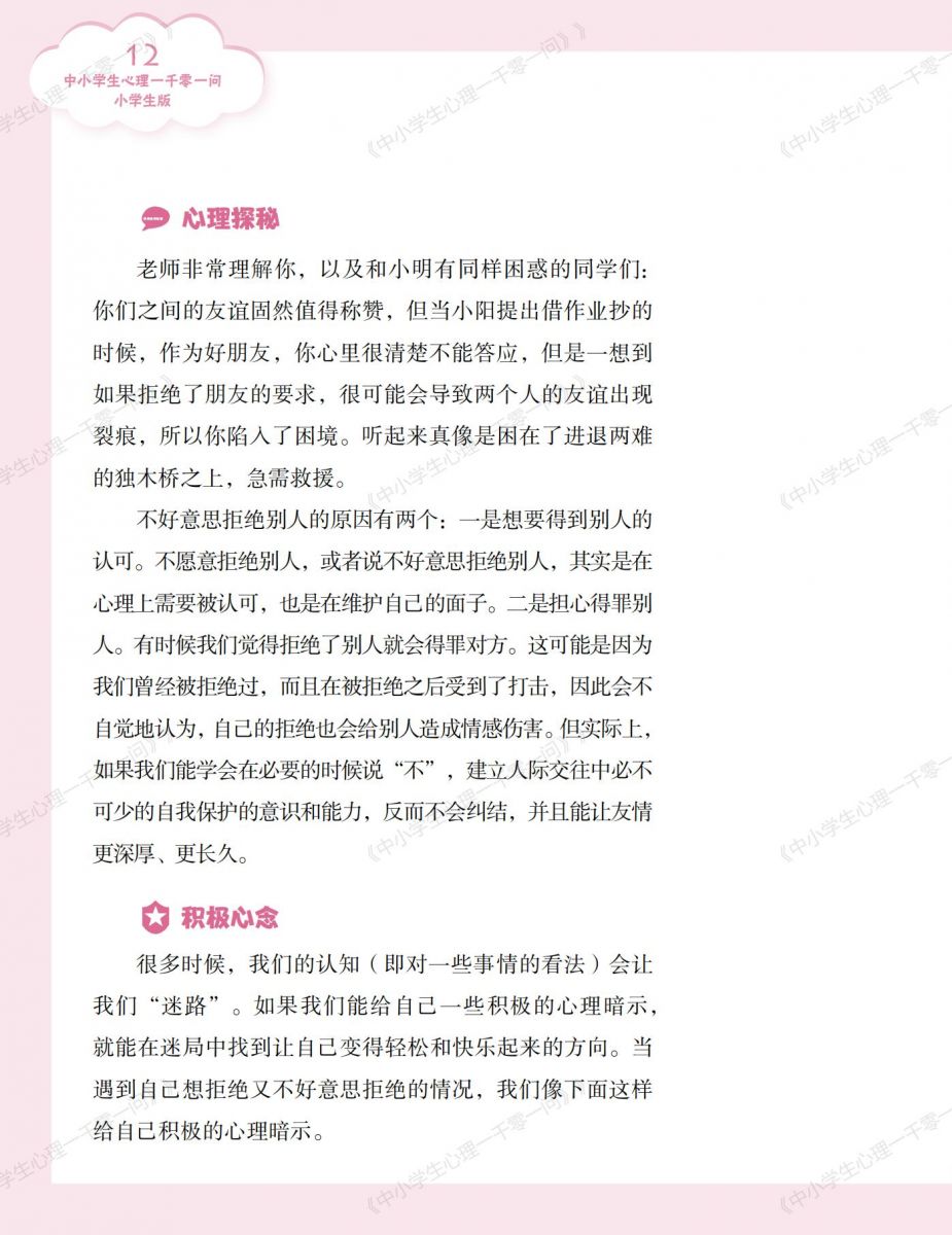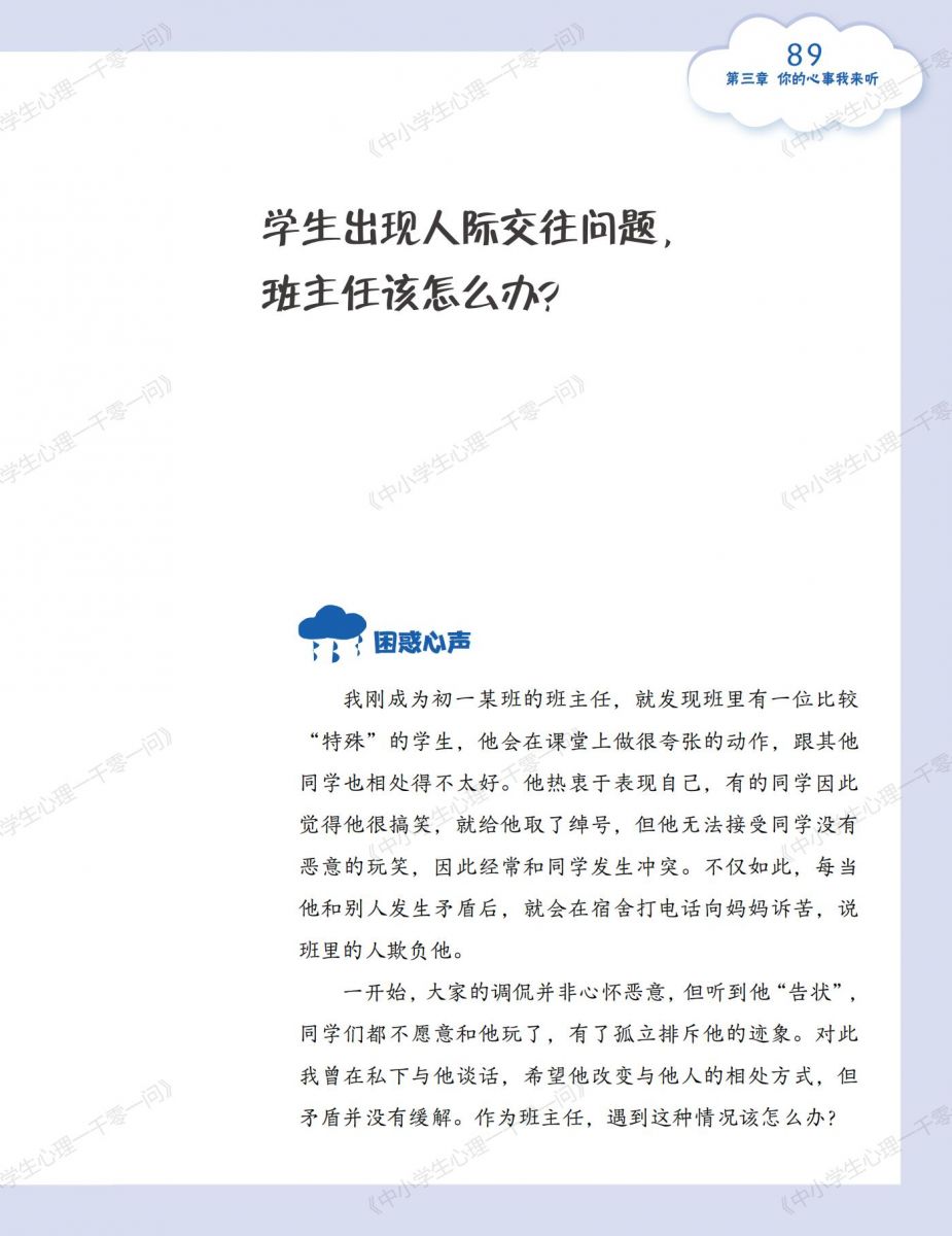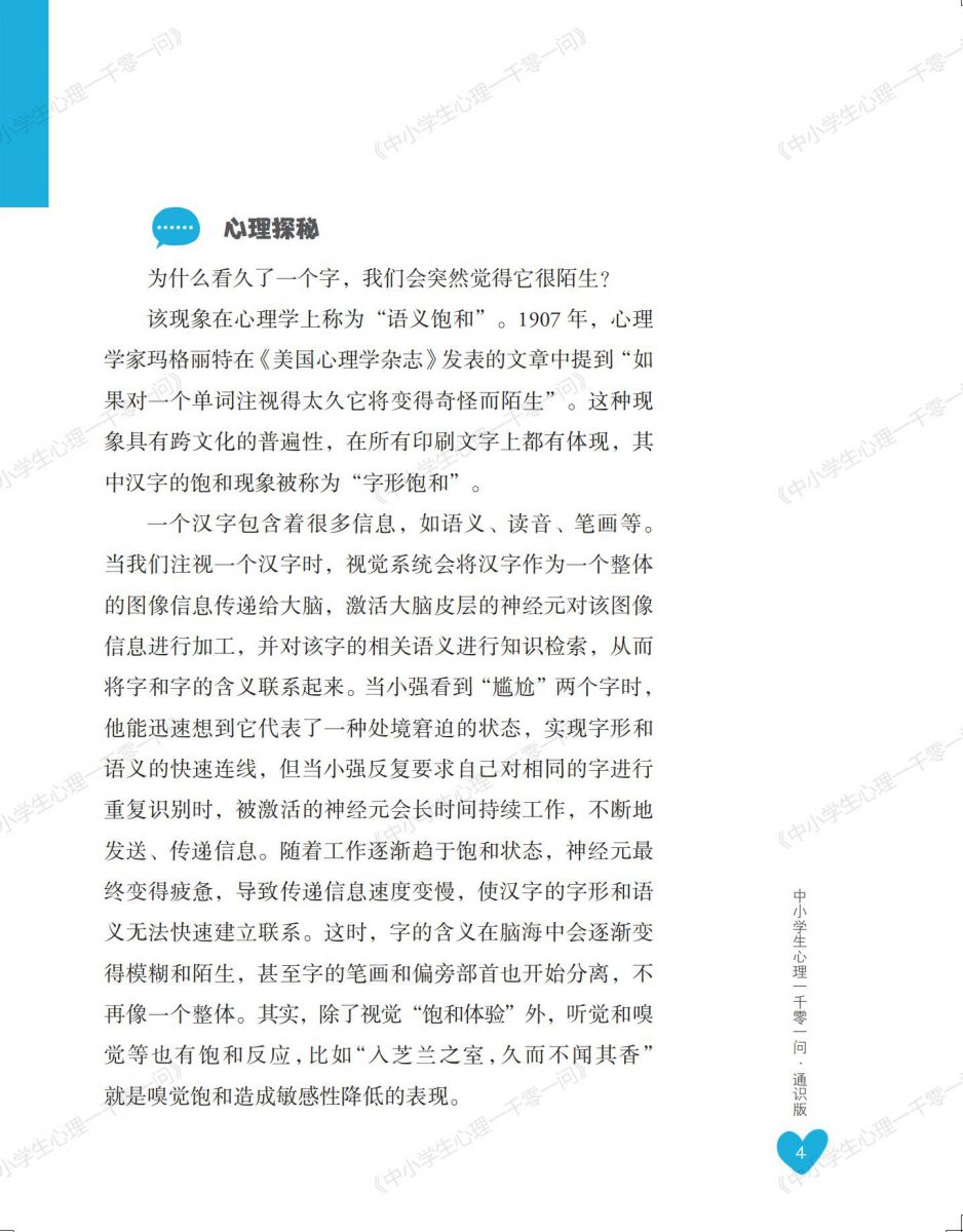 《中小学生心理一千零一问》丛书的内容编排具针对性。各个版本紧密围绕不同受众的需求与特点进行设计,使中小学生能够获取贴合自身成长困惑的解答,教师能获得适切的教学方法,家长能得到家庭心理教育的指导,通识版又能拓宽大众对心理问题的认知。