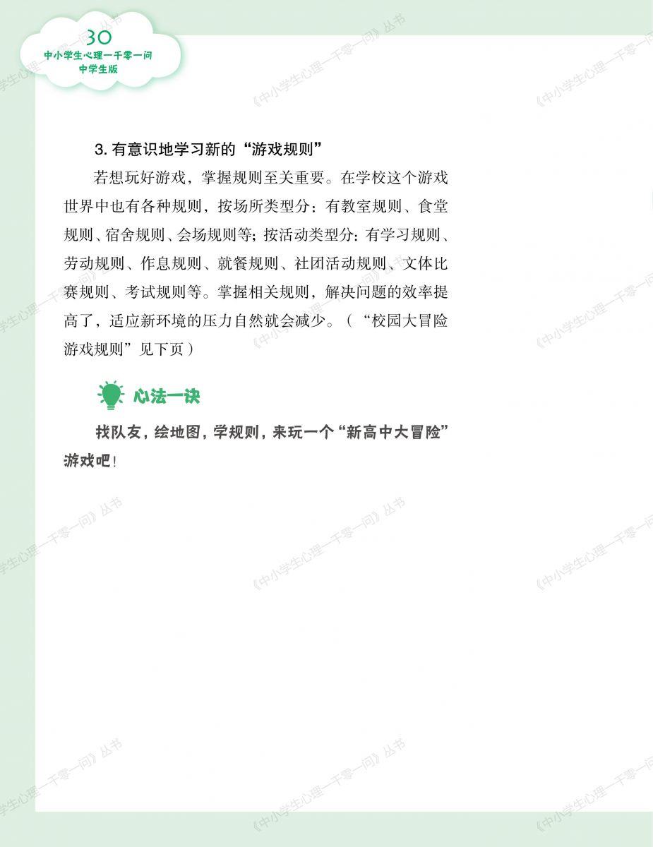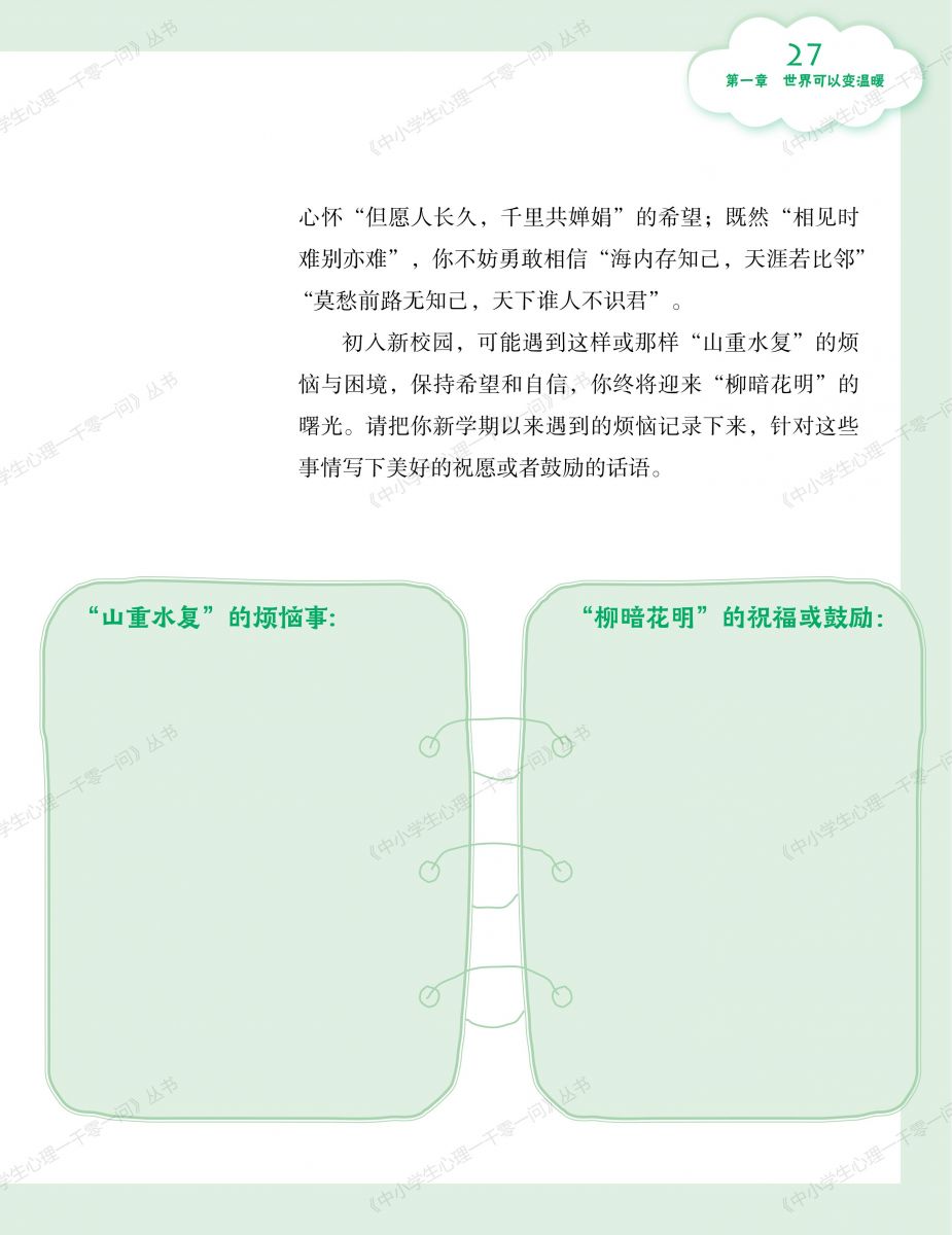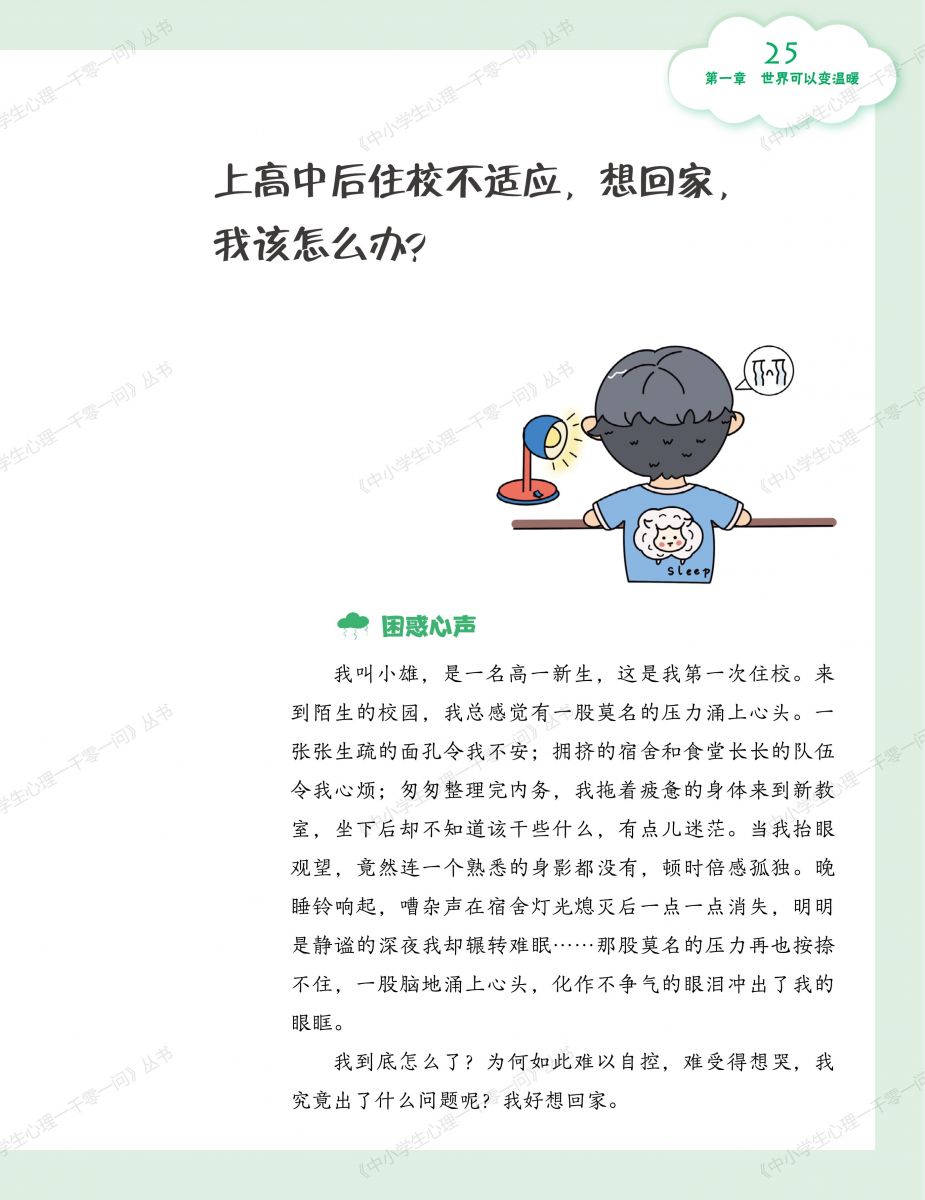该丛书涵盖了青少年在学习、生活、情感、社交等方面遇到的心理困惑和疑问,力求通过鲜活真实的案例、深入浅出的解析以及切实可行的自助建议,帮助读者在深入理解心理健康知识、熟练运用心理健康问题解决技巧的同时,找到适合自己的解决之,凸显了较强的专业性、实用性和可读性,并得到林崇德教授、俞国良教授、边玉芳教授的认可和赞誉。