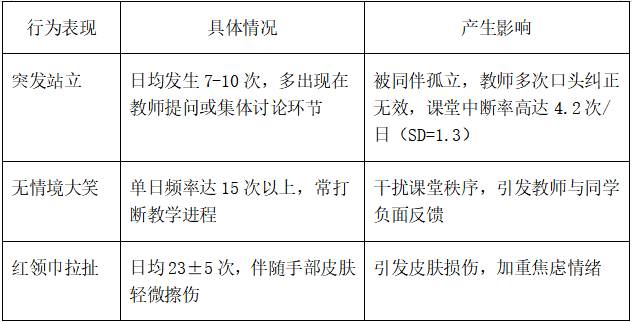 3.沟通意图:突发大笑与站立行为背后,实则是露露表达需求遭受阻碍的外在体现。从详细的行为日志可知,60%的站立行为发生在她期望回答问题却未被教师点名之时,她试图以这种较为突兀的方式吸引教师注意、获取发言机会;而大笑行为大多出现在她尝试与同伴互动失败之际,是她在社交沟通受挫后,以一种不恰当方式宣泄情绪、表达内心诉求的表现。