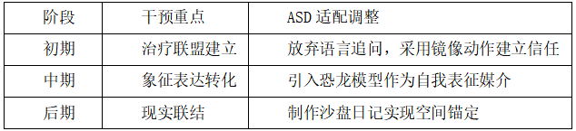 此改良方案使传统沙盘治疗突破ASD儿童的象征理解障碍,在20次干预中逐步实现从感官代偿到情感外化,最终达成自我叙事的辅导目标。通过亲子沙盘治疗与家庭任务(如“无声积木”游戏),露露与母亲重建情感联结。家庭冲突频率由每日爆发减少至每周1-2次。