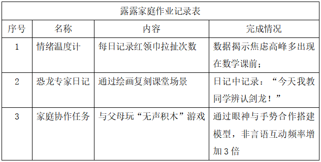 此场景促成关键家访——母亲首次坦承自己在职业与母亲角色间的撕裂感,并同意参与亲子沙盘治疗。后续联合沙盘治疗中,露露教会母亲用沙粒制作“恐龙蛋蛋糕”,母女在非言语互动中重建情感联结。当最后一次治疗结束整理沙具时,露露突然将“小恐龙戴红领巾”的场景拍照存入儿童手表,宣布:“这是我的毕业作品!”至此,沙盘从创伤性投射空间,成功转化为其自我整合的见证媒介。 辅导结束后,心理教师给露露母亲布置了家庭作业,记录露露的行为反馈。(见图4)
