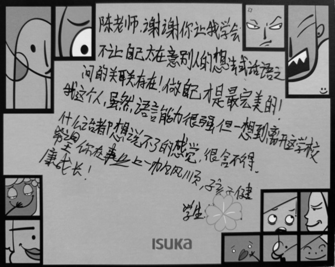 在毕业离校前夕,她送给老师一张贺卡,上面写着:谢谢老师让我学会不要太在意别人的想法……她能有这样的反馈,说明辅导过程中的认知调节工作是有效的,她的认知真的有所改变了。