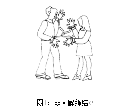 师:我与搭档保持手部相对位置,自己左手轻拎对方右手线条,使其从自己右手腕下圈穿过,右手腕顺势从上往下穿过那根线,理顺对方的线和自己右手腕手圈,轻轻挣脱,最终解开绳结。