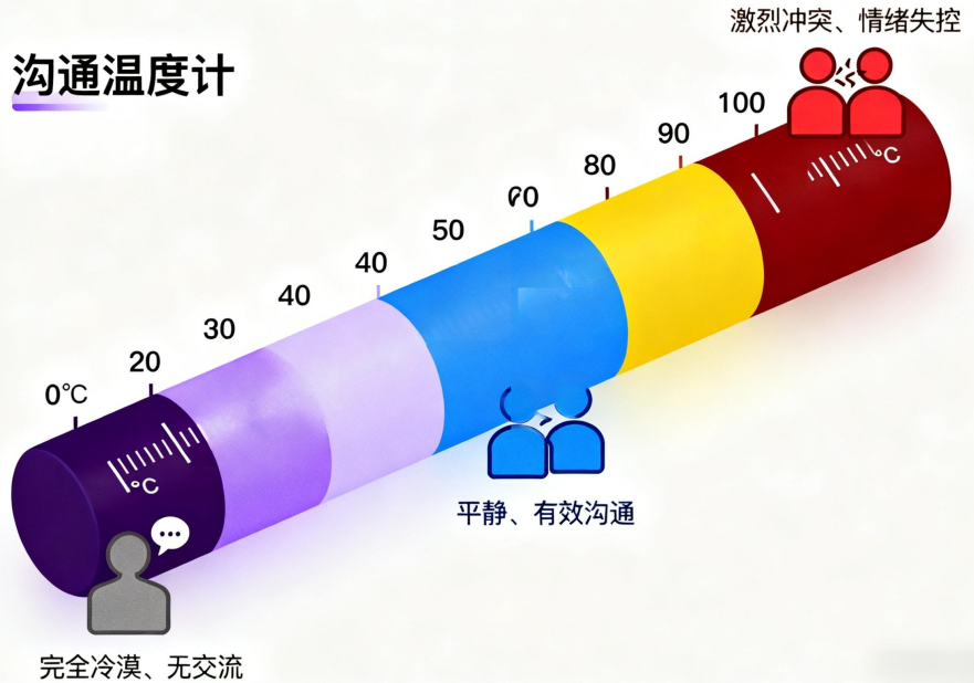 1.沟通温度:日常沟通温度从“50-90℃”稳定在“30-60℃”,高温冲突(80℃以上)从每周3次降至0-1次;
