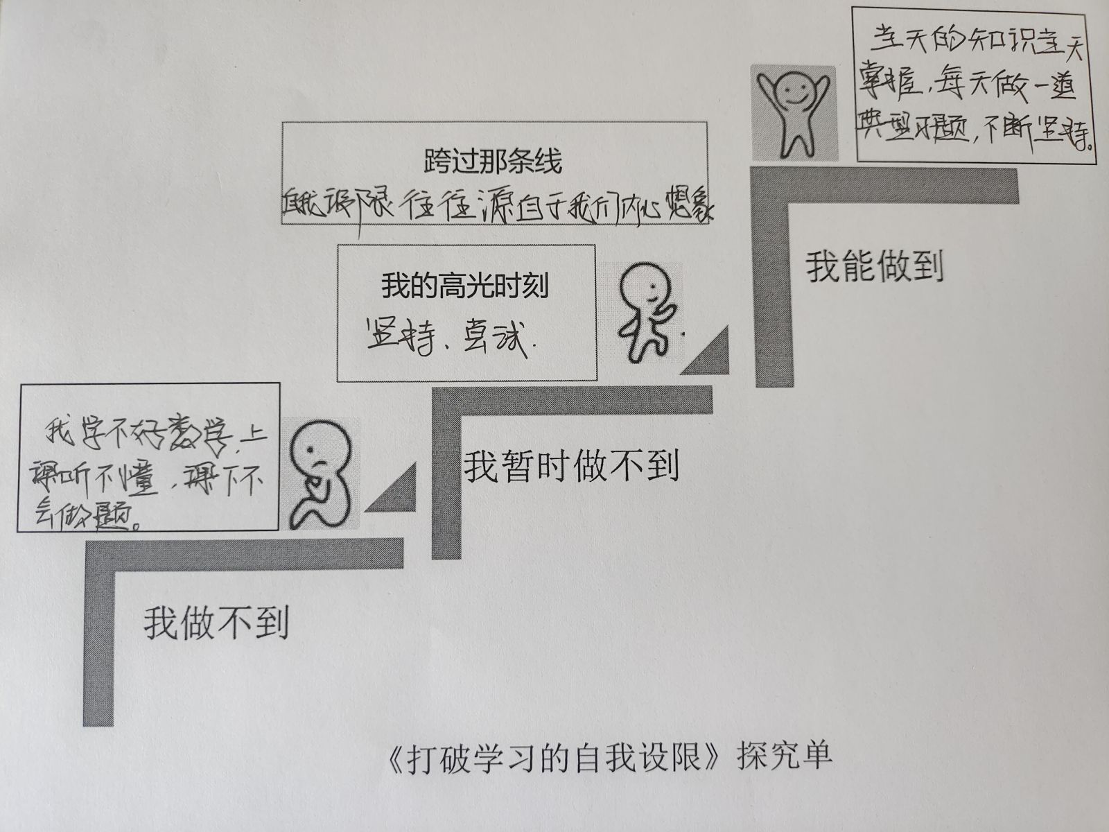 基于此,我们设计了打破学习的自我设限一课。从“我做不到”、“我暂时做不到”和“我能做到”三个主要环节,层层递进引导同学们觉察自我设限现象,从自身经历资源中寻找打破自我设限的技巧和品质,并运用到日常学习和生活当中,促进自我成长。