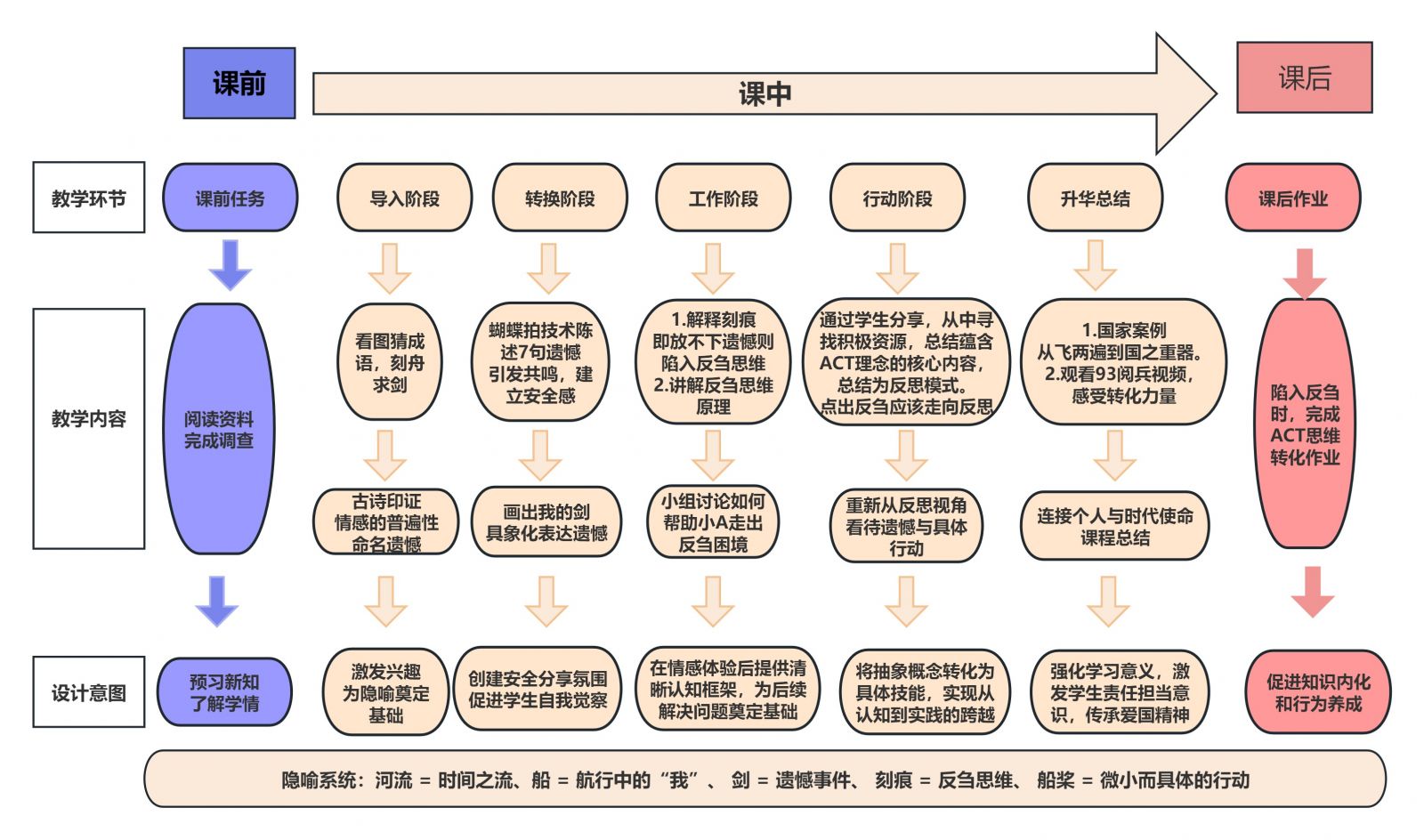 本课以“刻舟求剑”这一传统文化意象为核心隐喻,将ACT疗法“接纳-解离-价值-行动”路径转化为学生易于理解的“剑-桨-舵”系统,实现了心理学理论的本土化、生活化转化。