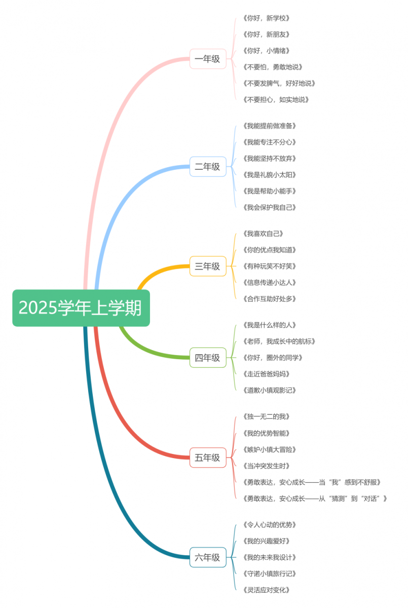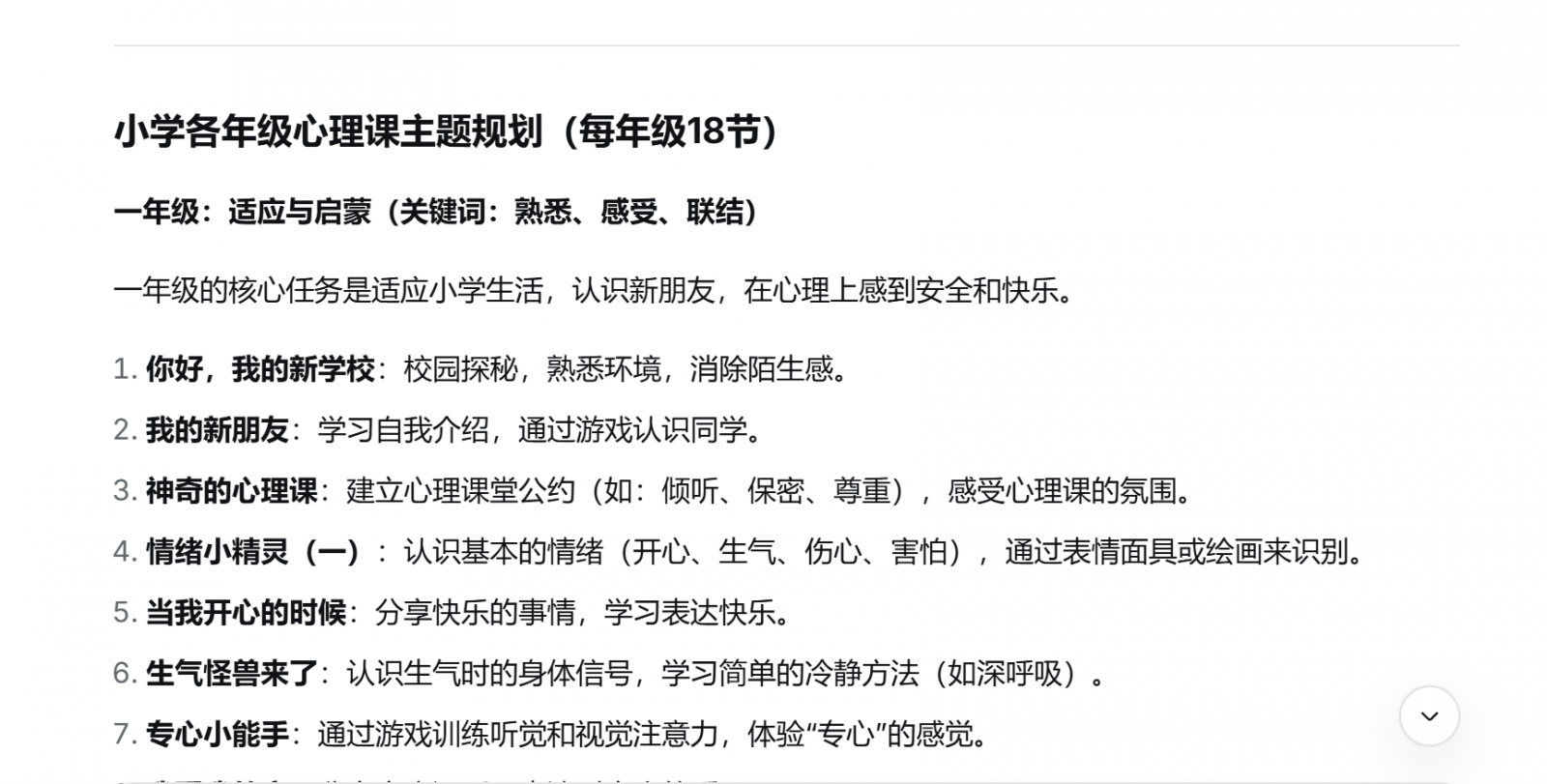 在学期起始阶段,我们可结合指导纲要与AI共同梳理适合本学段、本学期的大单元主题,AI可协助生成相应年级的单元主题建议、目标序列及课时安排初步方案。例如,我曾围绕一年级学生的心理发展需求,向AI提供了纲要中关于该学段的重点内容指引以及教材目录,向AI提问我可以如何系统安排课程。AI生成结果(部分)如下图: