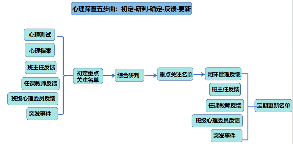 重点关注学生是每个学校心理危机事件发生的主要来源,因此精准而有效的筛查重点关注学生是开展初中生心理问题家庭教育支持的基础。经过大量的实践,我校总结出“闭环心理筛查五步曲”。采取“数盲”的方式,即参与其中的所有人都不知晓其他人所上报的名单,均以独立的途径将名单与具体情况汇总给专职心理教师。结合心理测试结果、各种途径上报名单的重合性,再从行为、情绪、负性事件等方面进行评估,心理教师初定重点关注名单。在学校心理工作小组的研判后,确定学期初的重点关注学生名单。在闭环管理反馈、班主任反馈、任课教师反馈、班级心理委员反馈及平时突发事件处理的基础上,定期更新名单。依据心理问题的严重程度,将名单分为三类,第一类:确诊心理疾病或有自伤、自杀经历或自杀想法的学生,第二类:行为或情绪明显异常且有突发事件经历的学生,第三类情绪或认知有异常但暂时没有行为异常的学生。筛查重点关注学生步骤(如图1),其他没有进入重点关注范畴的学生,一并划入第三类,作为全员关注对象。
