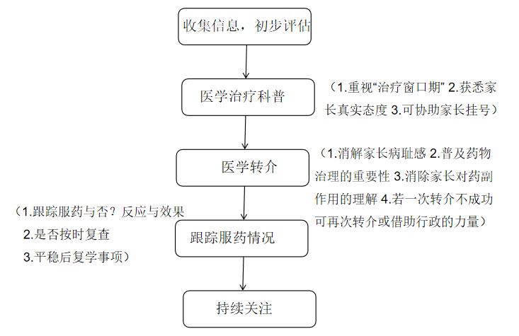 《 中国国民心理健康发展报告(2019-2020)》显示,我国青少年抑郁检出率为 24.6%,其中轻度抑郁检出率为 17.2%, 重度抑郁检出率为 7.4%。可见,青少年患心理疾病的检出率很高。在我校,患有心理疾病的学生也很多。心理危机或重点学生的家长,面对的难题与困惑更多,也更专业化,更需要学校的教育支持。针对这部分家庭,我校施行了“医教协同”式家庭教育支持策略,即通过搭建学校与医院之间的心理工作桥梁,给予家长疾病科普、就医指导、转介跟踪等,以达到支持这部分家庭教育的效果。(流程图见图4)如,一初二女生家长因孩子长期失眠求助心理老师,经过心理老师与孩子的初步访谈,了解到孩子其睡眠、饮食、情绪都出现了异常,还会忍不住自伤(家长不知道)。初步评估该生有抑郁症的可能,建议医学转介。但是家长认为孩子只是“不高兴而已”,想让老师给予咨询就可以了。经过心理老师的医学治疗科普,家长才认识到就医的作用远远大于咨询。老师主动跟踪其就医情况,得知孩子服药后产生了很大的身体反应,家长就认为服药没用。在老师的再次药物科普后,家长才知道需要频繁到医院去调换药品与药量。在几次药物调整之后,该生情况日趋平稳。