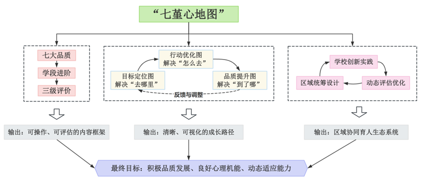 “七堇心地图”不仅是一套工具,更是一个需要区域行政推动、专业支持与多方参与才能有效运转的生态系统。其实施遵循“区域统筹设计—学校创新实践—动态评估优化”的闭环逻辑:区域层面负责顶层设计、资源开发、标准制定与质量监测;学校层面结合本校文化与资源,将“地图”转化为具体的校本化课程与活动;同时,通过持续收集学生心理测评数据、活动反馈、典型案例等信息并开展效果评估,不断反哺优化区域指南与学校实践,形成“设计—实践—评估—优化”的良性循环。