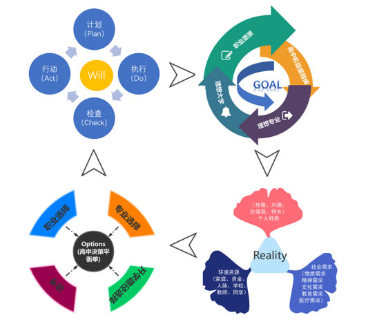 (二)理论溯源与研究缺口 近年来学界对生涯教育的探讨,主要聚焦于两个经典理论的应用:其一是John Holland在二十世纪中期提出的职业兴趣分类框架(即RIASEC模型),另一个则是Donald Super同期发展的生涯阶段理论。这两个理论虽然诞生于工业化时代,至今仍被广泛引用。然而,这些研究在实际应用过程中逐渐显现出一些普遍存在的问题。首先,测评工具的过度使用容易使个体被贴上固定标签,比如通过MBTI或霍兰德代码将人简单归类。这种分类方式虽然便于操作,却可能忽视每个人在不同情境下的动态发展潜力。更值得关注的是,当Z世代(1995-2009年出生)开始进入职场时,这套基于婴儿潮世代(1946-1964年)职业特征构建的理论体系,其解释力已出现明显衰减。有研究显示,在TikTok等新兴平台从业者的职业选择中,传统理论的预测准确率下降约37%。正如用二十世纪的交通规则难以驾驭自动驾驶汽车一样,传统的指导方式在面对元宇宙职业、数字游民等新兴领域时,同样显得力不从心。 鉴于这些局限性,本研究决定引入企业管理领域中广泛使用的GROW模型,并探索其在高中生涯规划教育场景中的转化应用,以期克服现有理论的不足,为学生的职业发展提供更加灵活和有效的指导。之所以选择GROW模型,是因为其框架与高中生涯规划课程高度契合:Goal(目标设定)对应学生未来的职业、大学、专业规划;Reality(现状分析)评估学生的性格、兴趣、价值观、能力与职业及专业目标的匹配程度;Option(发现路径)探索升学途径与生涯决策;Will(行动计划)制定生涯管理策略。
