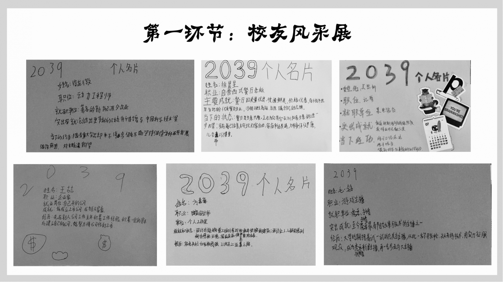 第一环节:校友风采展。以“15年后校友分享会”为情境,要求学生提前制作“15年后的个人名片”,内容包括姓名、职务、就职单位、主要成就或当下状态。课堂上,6位学生代表扮演“未来的自己”,分享职业成就故事。