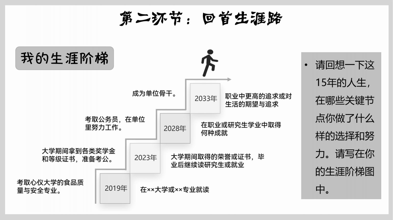 师:请你回想一下这15年的人生,在哪些关键节点(如高中毕业、大学期间、大学毕业或者是工作后的某一年)你都做了什么样的选择和努力。请写在你的生涯阶梯图中。