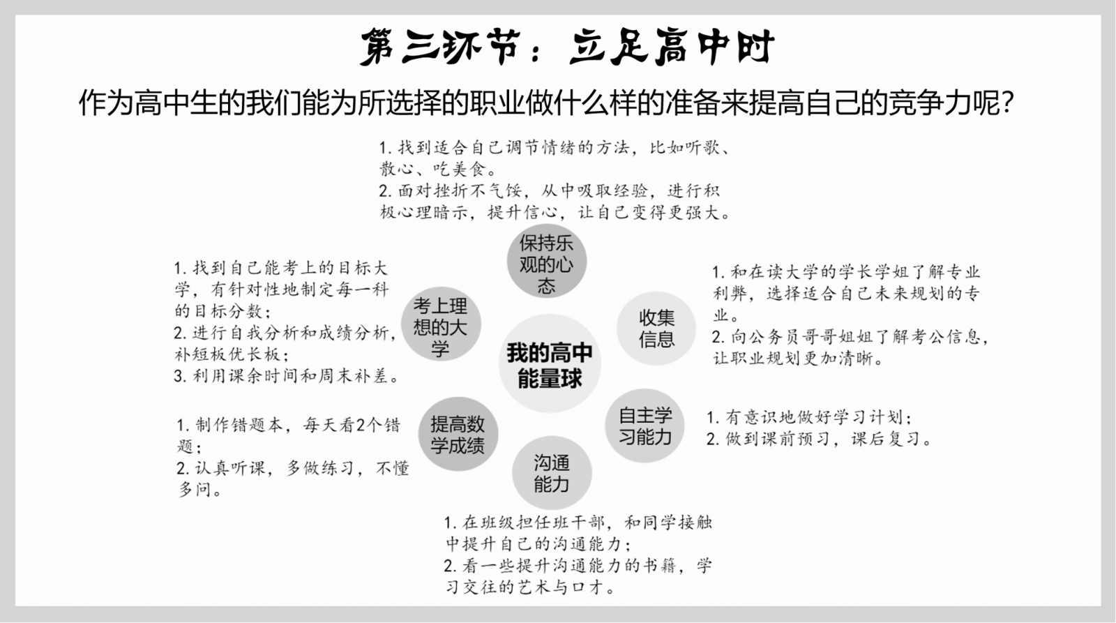 第三环节:立足高中时。教师以叶*学姐的“高中能量球”为例,展示学业、心态、能力等方面的准备,引导学生思考:“目标职业需要哪些核心能力?高中阶段如何培养?”