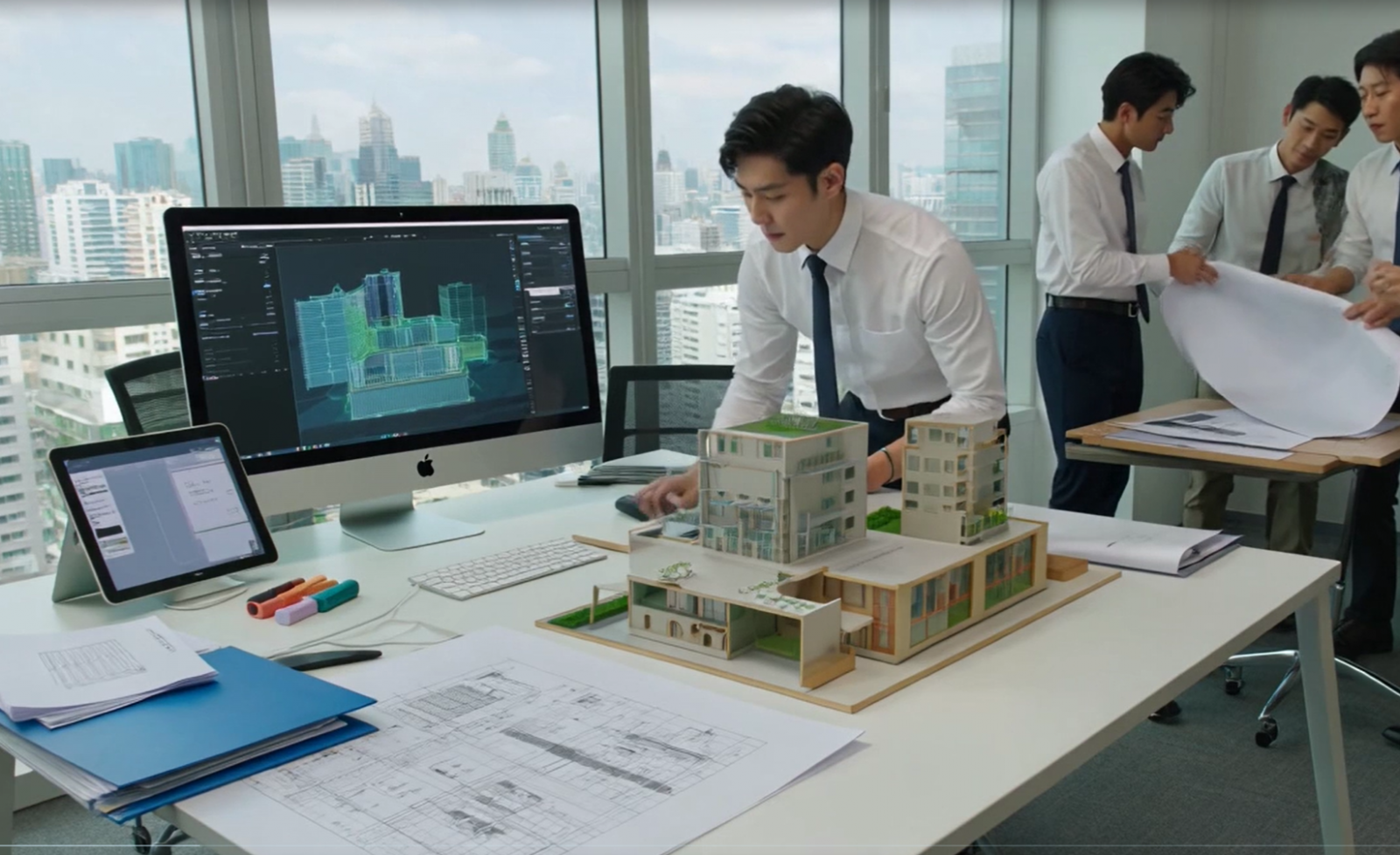 | 职业场景模拟与体验 | 生成一个建筑设计师工作室场景,人物正在用3D建模软件设计建筑,或手持蓝图与团队讨论。镜头穿插草图绘制、模型拼装的特写,背景有城市天际线。 | ![]() |