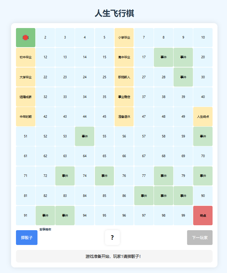 | 生涯唤醒 | 请设计一个人生飞行棋的网页游戏,适用于高一学生的生涯意识唤醒。 | ![]() |