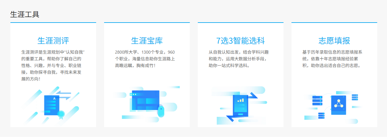传统的生涯教育由于师资资源有限,难以实现一对一个性化的生涯指导。人工智能技术的应用,使个性化的生涯指导变得触手可及,让每一位学生都有自己的“生涯教练”。我校引入“升学e网通平台”,为每位学生配备专属账号,该平台的生涯规划板块拥有丰富的生涯工具,为学生构建课后生涯自主探索的智能化阵地。(见图2)