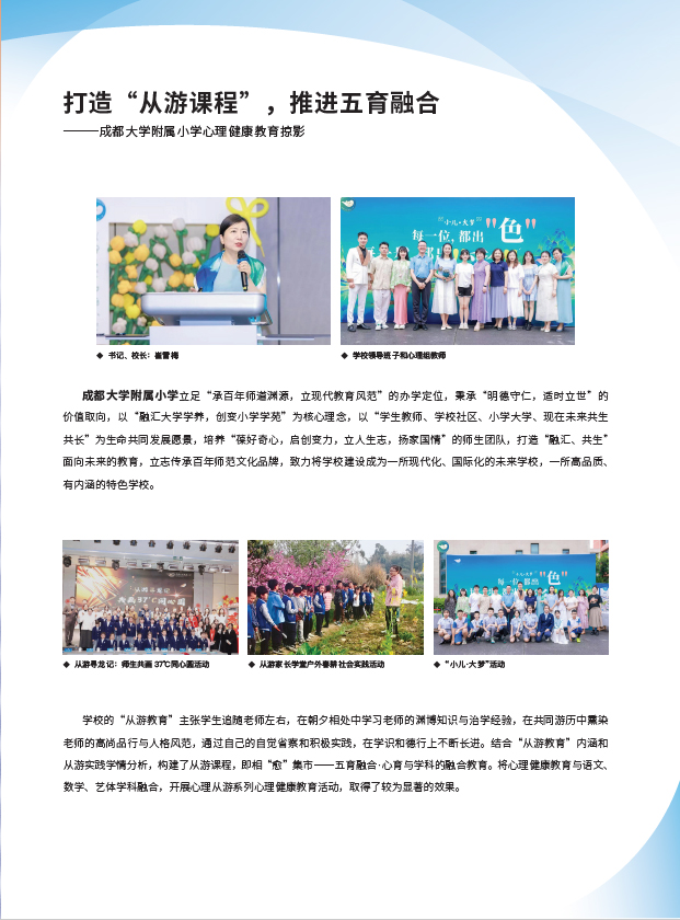 学校的“从游教育”主张学生追随老师左右,在朝夕相处中学习老师的渊博知识与治学经验,在共同游历中熏染老师的高尚品行与人格风范,通过自己的自觉省察和积极实践,在学识和德行上不断长进。结合“从游教育”内涵和从游实践学情分析,构建了从游课程,即相“愈”集市——五育融合·心育与学科的融合教育。将心理健康教育与语文、数学、艺体学科融合,开展心理从游系列心理健康教育活动,取得了较为显著的效果。
