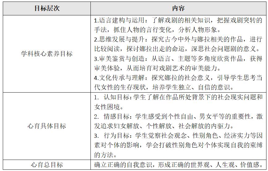 结合高中教学实际,语文教学的心育目标应符合高中生思维发展特点和心理发展需求,并以教材内容为依据来科学设定。笔者与语文老师设计教案时,在教学目标方面,设置了语文教学目标、心育具体目标和心育总目标三个层次。以统教版选择性必修中册第四单元《玩偶之家》的教学目标设定为例: