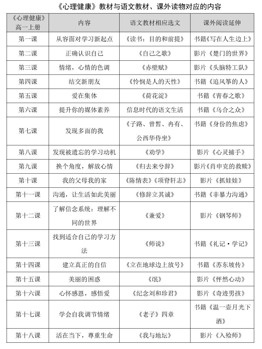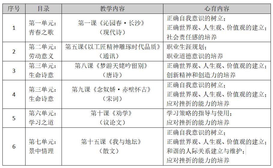 根据《中小学心理健康教育指导纲要》,高中生心育内容主要分为五大能力,这五大能力包括:“正确的自我意识的树立,正确的世界观、人生观和价值观的建立,学习策略的指导和使用,创新精神和创造力的培养,考试焦虑的克服,和谐的人际关系的建立与维护,职业生涯的规划,职业道德意识的培养,应对挫折的能力的培养,以及社会责任感的培养”。而语文教材中蕴含了大量心理健康教育因素,需要深入挖掘、有效利用。笔者团队与语文学科专家交流探讨,探寻出高中语文教材中典型的具有心育功能的教学内容。如必修一上册的六篇文章: