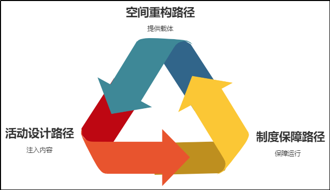 张佳.论空间正义的生态之维[J].北京大学学报:哲学社会科学版,2020,57(1):8.]理念保障儿童对校园空间的平等使用权与参与权,实现从“空间剥夺”到“空间赋权”的范式转变。借鉴雷·奥登伯格第三空间理论“中立性、可及性、对话性、低门槛性”特征,结合校园实际,本研究提出包含空间重构、活动共创与制度保障的三维路径(见图1),构建兼具育人功能与社会化支持的健康第三空间生态。