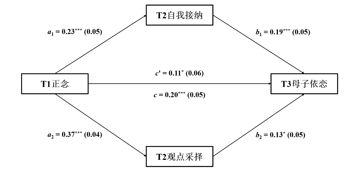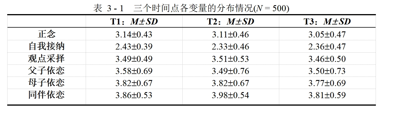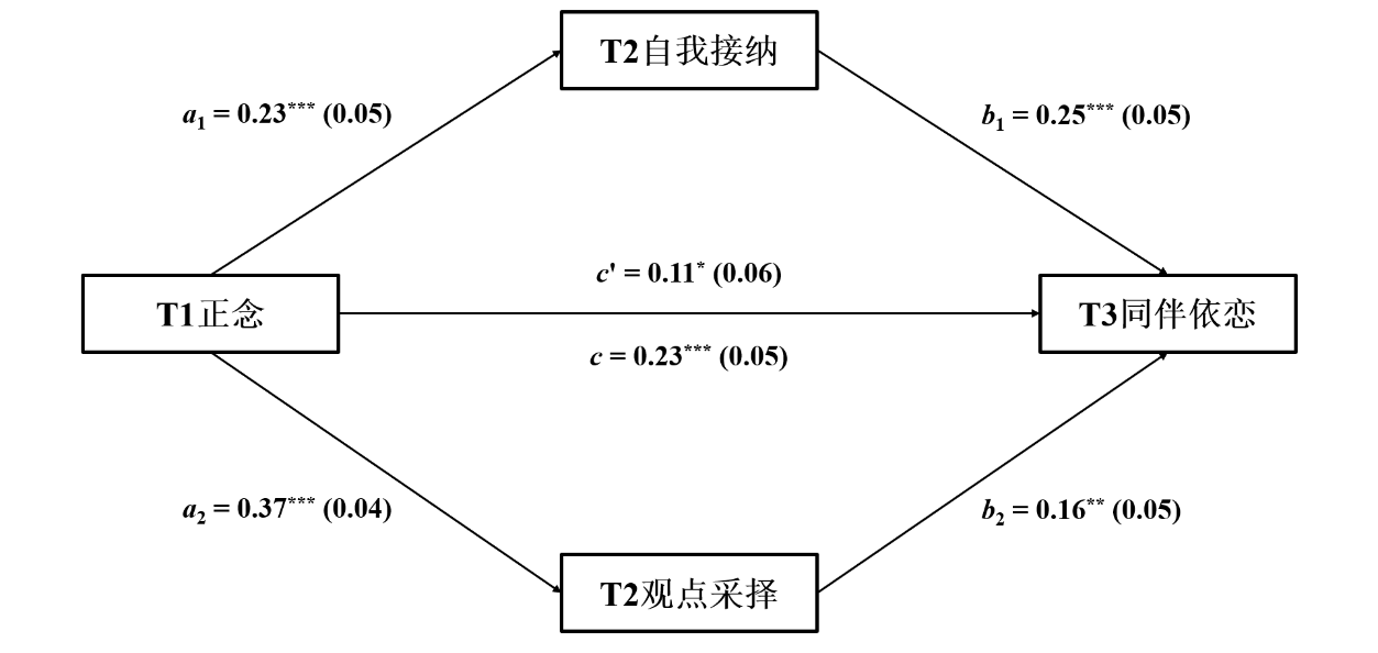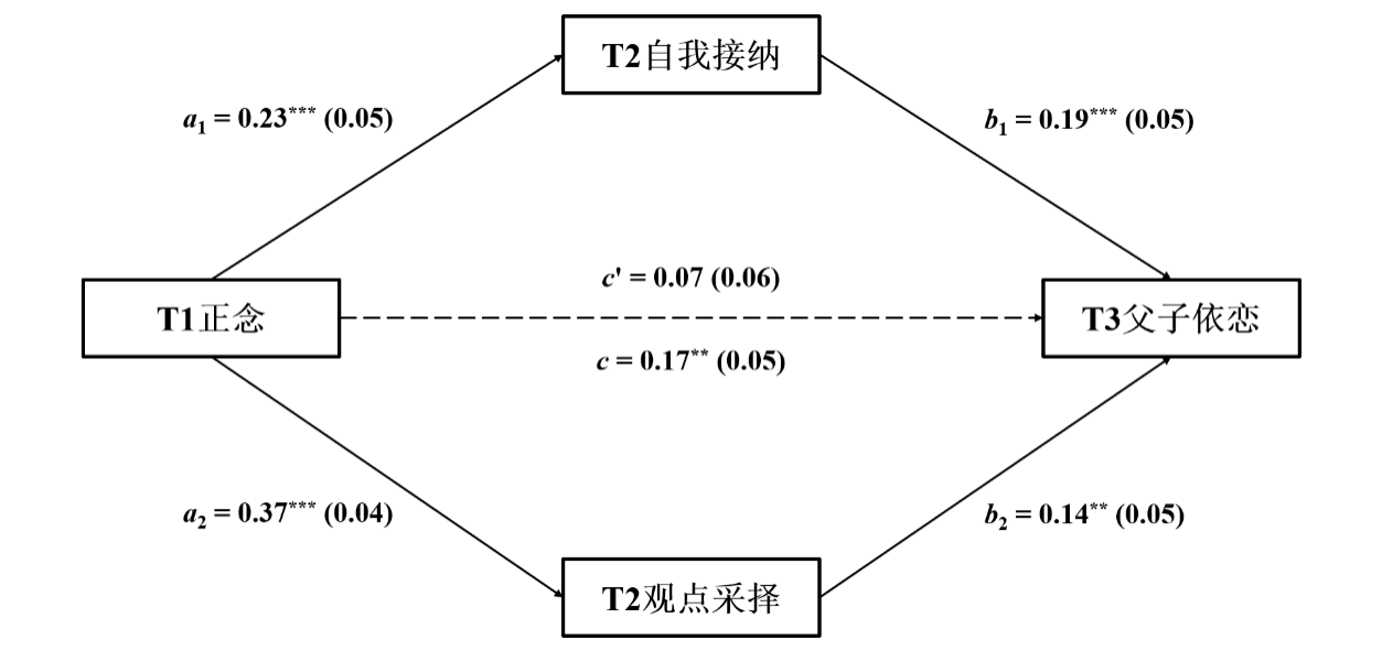 综上,本研究旨在构建并验证一个纵向并行中介模型,探讨正念如何通过提升自我接纳与观点采择,间接预测高中生父子、母子及同伴依恋水平。我们假设:自我接纳和观点采择在正念与高中生各类依恋关系之间起并行中介作用。