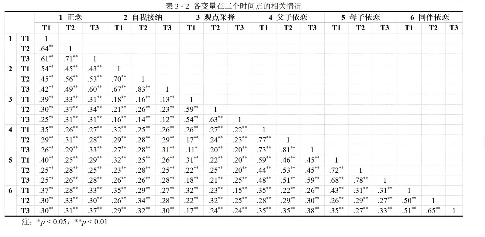 在追踪一年内,各变量都有一定的变化,在三个时间点上各变量的分布情况见表3 - 1。对三个时间点的变量数据做相关分析,各变量间的相关系数见表 3 - 2。