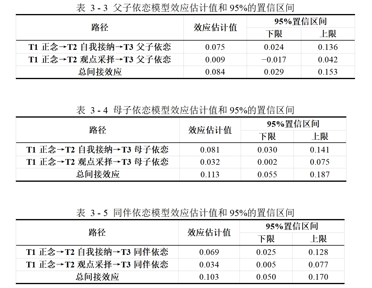 进一步间接效应分析结果如表3 – 3、3 – 4和3 – 5所示,T1正念→T2自我接纳→T3依恋路径的间接效应的95%置信区间均不包含0,表明自我接纳的间接效应显著,且总的间接效应均显著。另一方面,观点采择的中介效应在父子模型中不显著,而在母子依恋和同伴依恋模型中显著。
