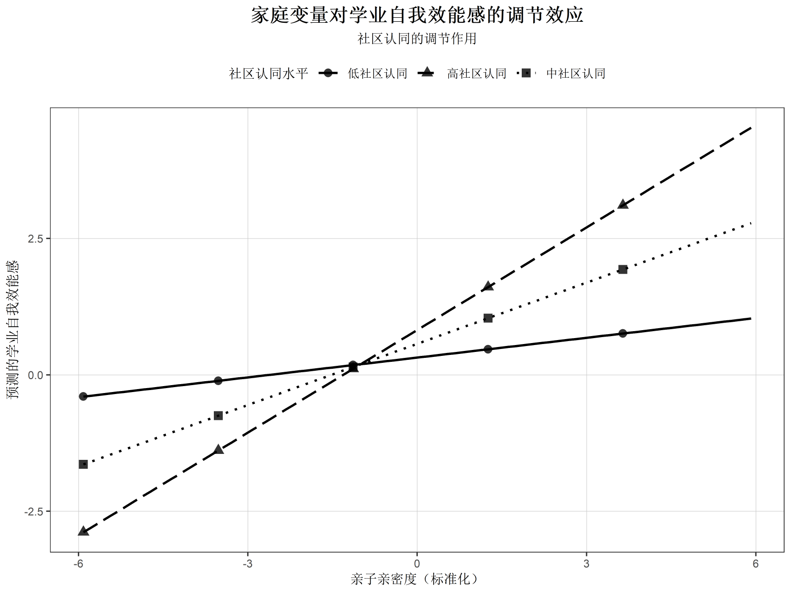 (三)社区认同感的强化调节效应本研究还发现了社区认同感的调节作用,结果显示,社区认同感显著强化了亲子亲密度对ASE的促进作用(β= 0.113),同时,社区认同感也强化了学校归属感对ASE的积极影响(β= 0.069)。这种双路径强化模式(强化家庭和学校因素的作用)支持了生态系统理论的假设,即外层系统通过调节近端系统的作用强度来影响个体发展轨迹[8]。