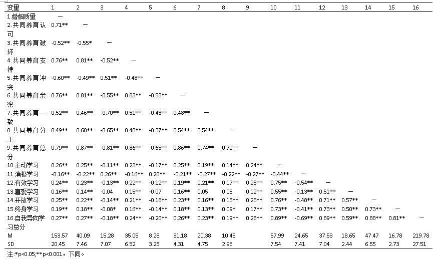 从表格中可以看出,父母婚姻质量和父母的共同养育呈显著正相关;父母的婚姻质量和初中生的自我导向学习呈正相关;父母的共同养育和初中生的自我导向学习呈正相关。