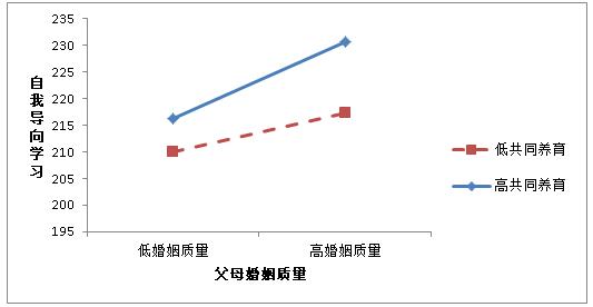 结果表明,对于父母共同养育水平较高的初中生(高于均值1个标准差),父母婚姻质量显著正向预测初中生的自我导向学习(β=0.35,t=3.32,p<0.01,df=642),而对于父母共同养育水平较低的初中生(低于均值1个标准差),父母婚姻质量对初中生的自我导向学习的预测作用不如父母共同养育水平较高的初中生显著(β=0.18,t=2.15,p>0.01,df=642)。