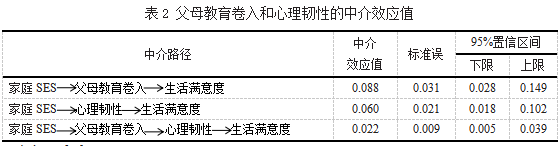 中学生家庭社会经济地位与生活满意度的关系:父母教育卷入和心理韧性的链式中介作用