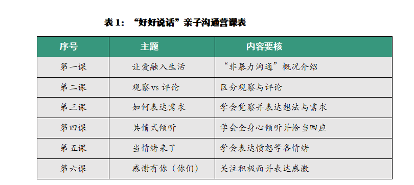 “好好说话”亲子沟通营通过非暴力沟通训练、绘画表达、心理剧等方式,帮助理解沟通的重要价值,尝试剖析沟通中的问题类型,演练积极有效的沟通方式,进而提升家庭凝聚力。“好好说话”成长营课程设置见表1。