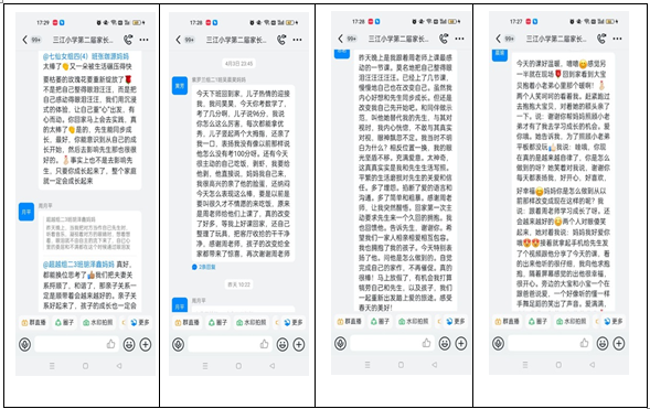 3.从家庭层面——首先是家长的育儿故事层出不穷,种子家长辐射全校家长,使更多的家长 意识到孩子的问题只是一面镜子,源头在家庭、在家长——父母好好学习,孩 子天天向上。其次是孩子方面整个人的状态好起来了,学习状态和精神面貌都有了质的飞跃。(更多家长成长感言见我们的《三江润育 家校共进》一书)。