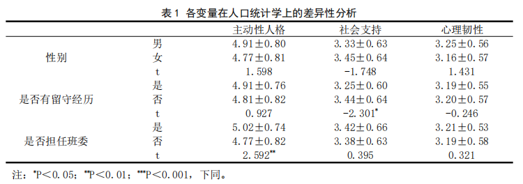 为考察初中生主动性人格、社会支持及心理韧性在人口学变量上的差异,对数据进行独立样本t检验。研究结果表明:在性别维度上,三者皆不存在显著性差异;在是否有留守经历的维度上,社会支持(t=-2.301,p<0.05)存在显著性差异,没有留守经历的学生得分高于有留守经历的学生;在是否担任班委的维度上,担任班委的初中生主动性人格显著高于没有担任班委的学生(t=2.592,p<0.01),结果见表1。