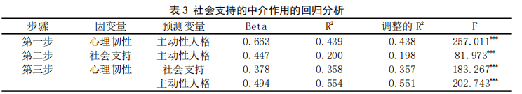 假设主动性人格是自变量,心理韧性是因变量,社会支持是中介变量。根据温忠麟、张雷和侯杰泰等[17]提出的检验程序来检验心理资本的中介机制,三步回归分析结果如表3所示。表3数据显示,主动性人格对心理韧性具有显著直接预测作用(β=0.663,P<0.001),主动性人格对社会支持亦具有显著直接预测作用(β=0.447,P<0.001)。当社会支持和主动性人格同时对心理韧性进行预测时,二者均对心理韧性具有显著预测作用(β=0.378,P<0.001;β=0.494,P<0.001)。