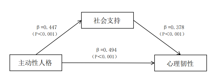 (4)社会支持在主动性人格与心理韧性之间起部分中介作用。
