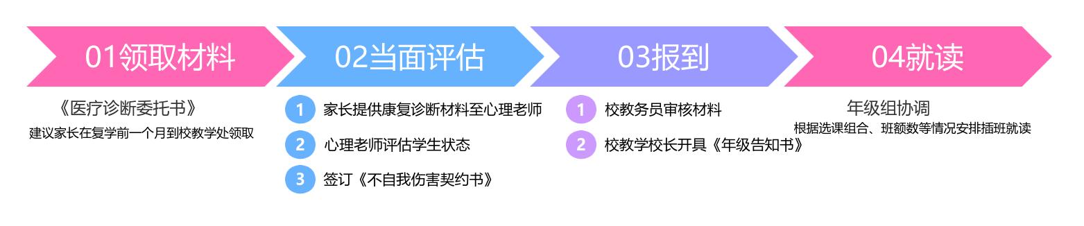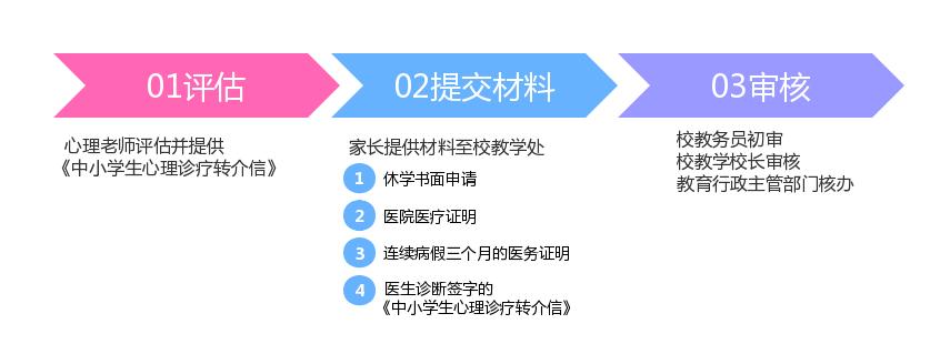 流程第一步是申请休学的学生到心理老师处评估,并领取《中小学生心理诊疗转介信》去医院就诊。宁波市教育局推行学生心理健康医教结合项目,心理老师可以通过“绿色通道”预约系统帮助学生及时就医。第二步,家长提供休学书面申请(包括学生班级和姓名、因何事申请休学、休学期间安全自负、学生和家长的签名)、医疗证明、连续病假三个月的医务证明和医生诊断签字的转介信至学校教学处。第三步,学校审核,并提交教育行政主管部门核办。