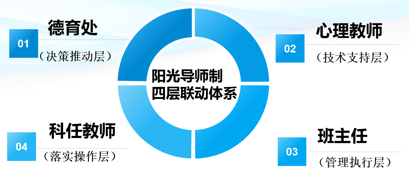 德育处、心理老师、班主任、科任老师形成合作共同体,每个人各司其职,承担相应的职责,构建协同治理模型,形成决策推动层、技术支持层、管理执行层、落实操作层等四层级联动体系。