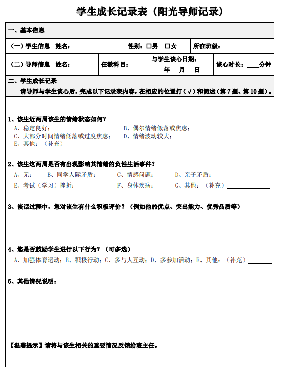 阳光导师与学生谈心后要填写《学生成长记录表》并提交给班主任进行保管。学校将会通过谈心记录完成率、危机转介及时率等过程性指标评估阳光导师实施效果。