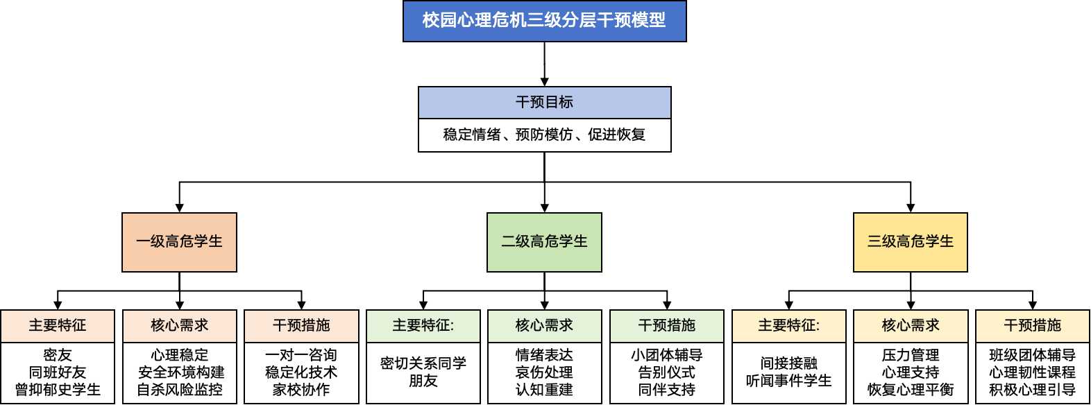 因此,本次针对学生自杀事件后实施的"四步法"心理危机分层干预模式,通过快速反应、科学筛查和分级干预,有效缓解了危机事件对学生心理的负面影响,避免二次伤害和模仿行为的发生。