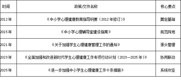 心理健康教育是落实立德树人根本任务、促进学生全面发展和健康成长的基石。回顾我国心理健康教育政策的发展历程,可以清晰地看到一条不断深化、细化、系统化的演进路径。一是从宏观指导走向微观落实,工作重心不断下沉,操作性日益增强;二是从基础教育拓展至全学段覆盖,服务体系日趋完善;三是从侧重于问题干预转向注重全面发展与积极预防,更加关注全体学生心理潜能的培育;四是从学校教育主导演进为家校社协同共育,强调打破壁垒,形成合力;五是从依赖兼职为主转向强调专业化队伍建设,对师资的数量、质量与全员素养提出了明确要求。