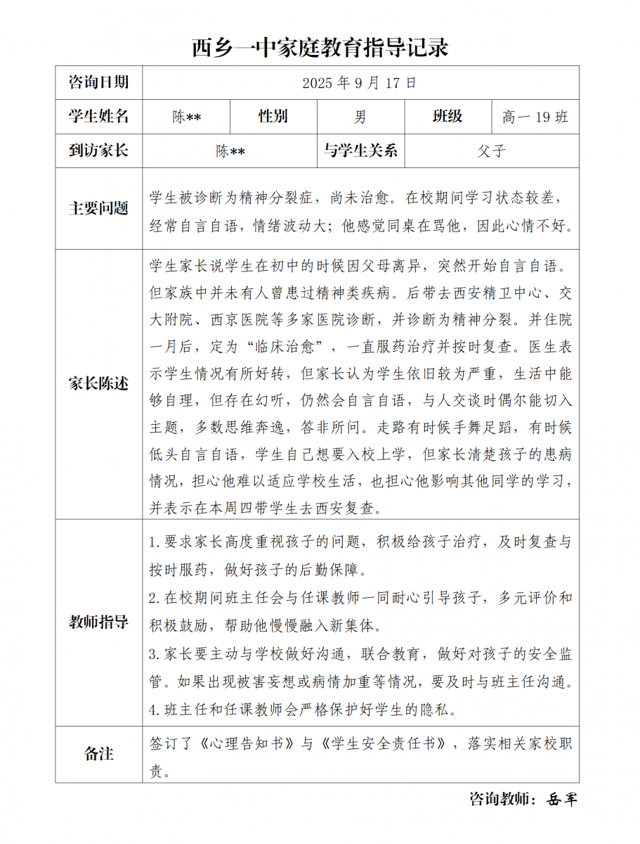 针对存在心理困境的学生,学校为每位学生建立了“一生一档一策”专属成长档案。该档案包含三个部分:第一部分对学生心理危机发生的原因与时间进行了详细记载,同时记录了先前学校及医院实施干预的具体过程与策略;第二部分记录了学生在校期间不同成长阶段的表现、教师采取的干预措施及效果,以及学生当前阶段的恢复状况;第三部分记录了与学生家长沟通交流的情况,包括向家长印发《心理安全告知书》,告知学生在校期间在认知、情感、意志和行为方面的特殊表现,与家长签订的各类安全责任书,以及家访记录等。此份成长档案为学校开展长期跟踪支持工作提供了系统且准确的依据。