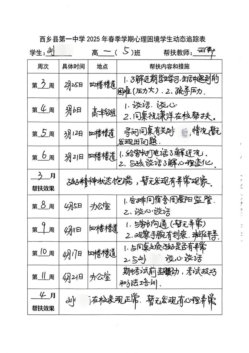 同时,保障家校沟通通畅有效。班主任与家长定期保持联系,不仅及时告知学生在校期间的情绪、行为及学习表现,更注重倾听家长对孩子在家情况的观察与担忧。双方一起分析问题产生的原因,确保信息同步,避免因沟通不畅导致帮扶措施出现偏差。
